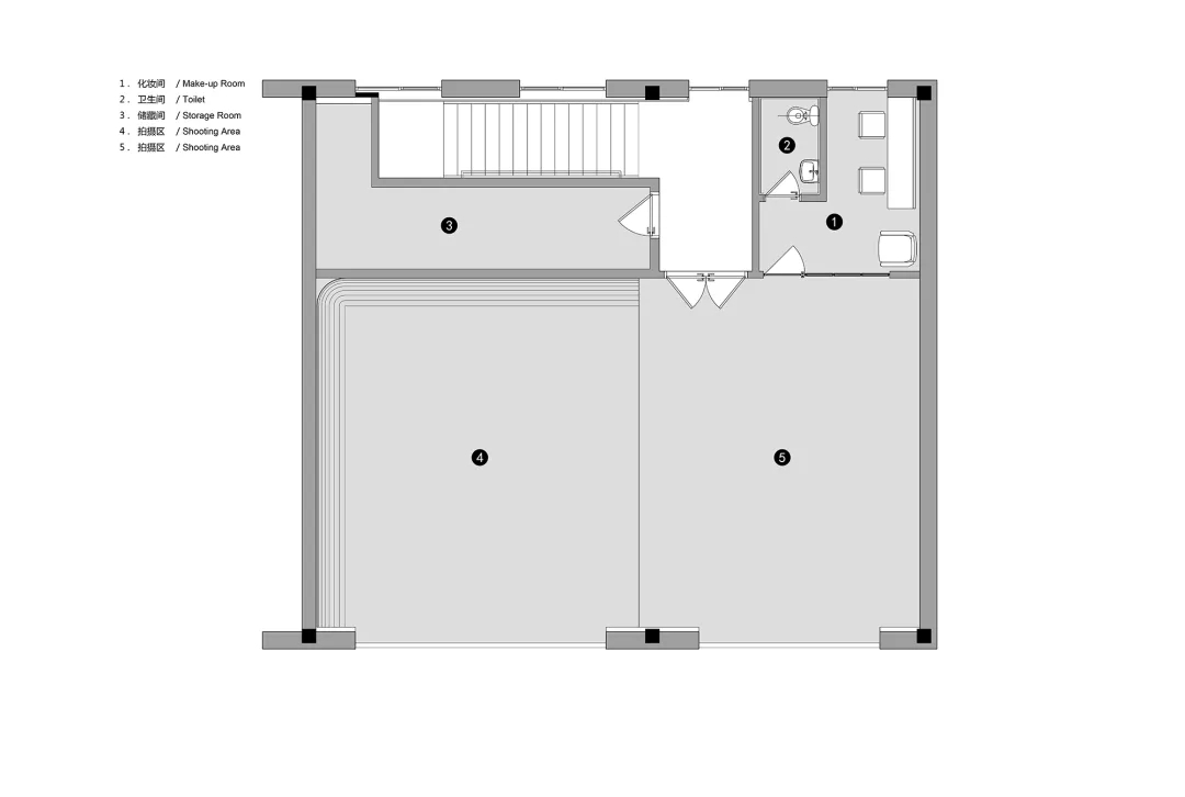 ASTUDIO攝影工作室位于CBD東側(cè)菁英谷文創(chuàng)園內(nèi),整體的設(shè)計風(fēng)格融合了粗狂工業(yè)風(fēng)和現(xiàn)代簡約風(fēng)。原有建筑為雙層的廠房空間,這種大空間非常適合拍攝的需求。攝影師希望把這個大空間改造為兩個相對獨立的拍攝區(qū),并且有各自獨立的化妝間和出入口,從而可以同時進行兩場獨立的拍攝。UUA將原有的二層建筑在豎向上改造成為了三層的空間,其中第一層包含接待區(qū)和1號拍攝區(qū),第二層整體為辦公空間,第三層是2號拍攝區(qū),這種豎向上的分區(qū)保障了兩場同時拍攝的獨立性。