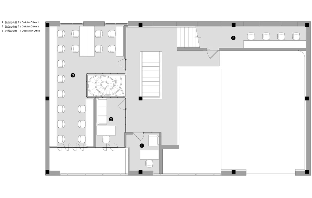 ASTUDIO攝影工作室是一個多功能的復(fù)合空間,UUA把拍攝、化妝、接待、辦公、會議、休閑等多種功能有機地融合在這個通高的廠房之中,空間緊湊又富于變化。拍攝區(qū)為最重要的功能單元,由于需要足夠的長寬高空間來滿足設(shè)置無影墻、布景布光以及拍攝距離等需求,所以設(shè)計師將一層的一半劃歸為1號拍攝區(qū),保留雙層通高的空間形式;另一半則加建出雙層空間,其中一層作為接待,二層作為辦公。廠房的三層因為原本具有足夠的層高,因此被設(shè)置為2號拍攝區(qū)。