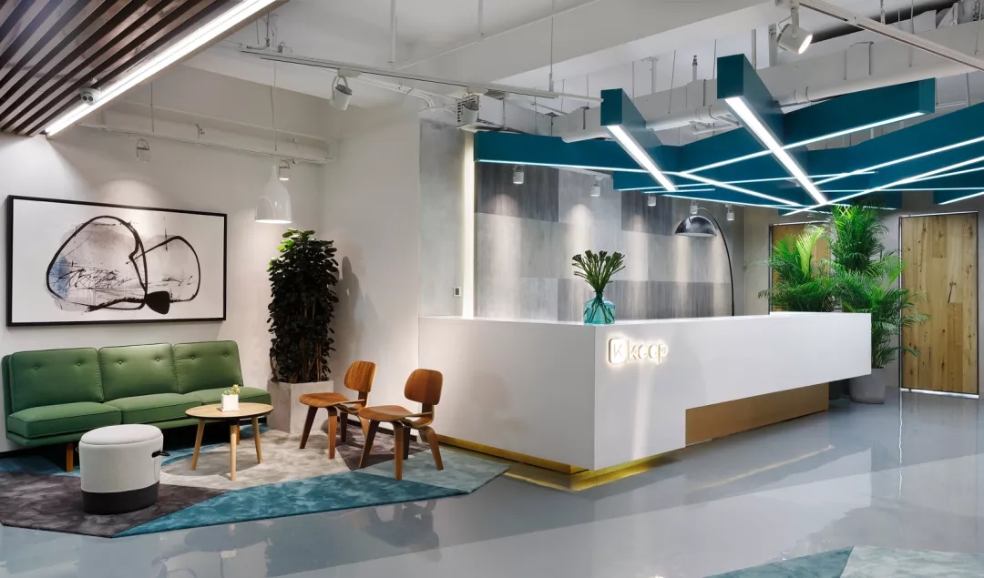 靠近電梯入口的前臺通過頂部的放射狀線條設計產生視覺延伸感,兩側區(qū)域通過軟裝陳設實現多層次的空間,靈活滿足接待、等候、會議及咖啡茶點的各種需求,員工和來訪人員各取所需互不干擾。