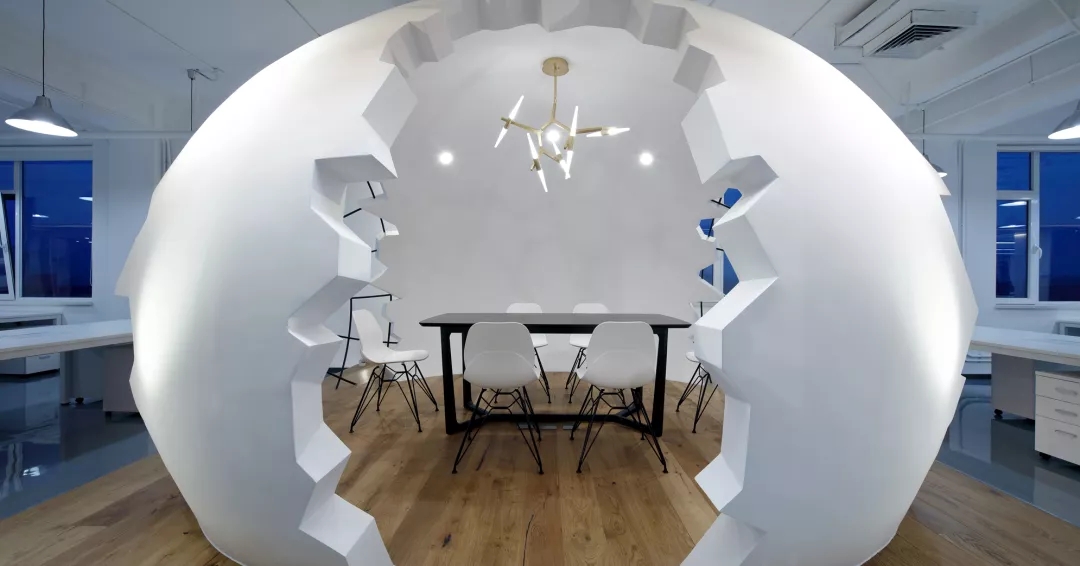 為了給開放式的辦公空間注入活力,我們在排排坐的工位場地正中設置了“破殼而出“的主形象——巨蛋討論區(qū),橢圓形的蛋壁實現攏音的隔音效果,兩側的鏤空引入自然光源,令這個裝置藝術般的討論區(qū)打破開放式工位的沉悶,成為視覺焦點。