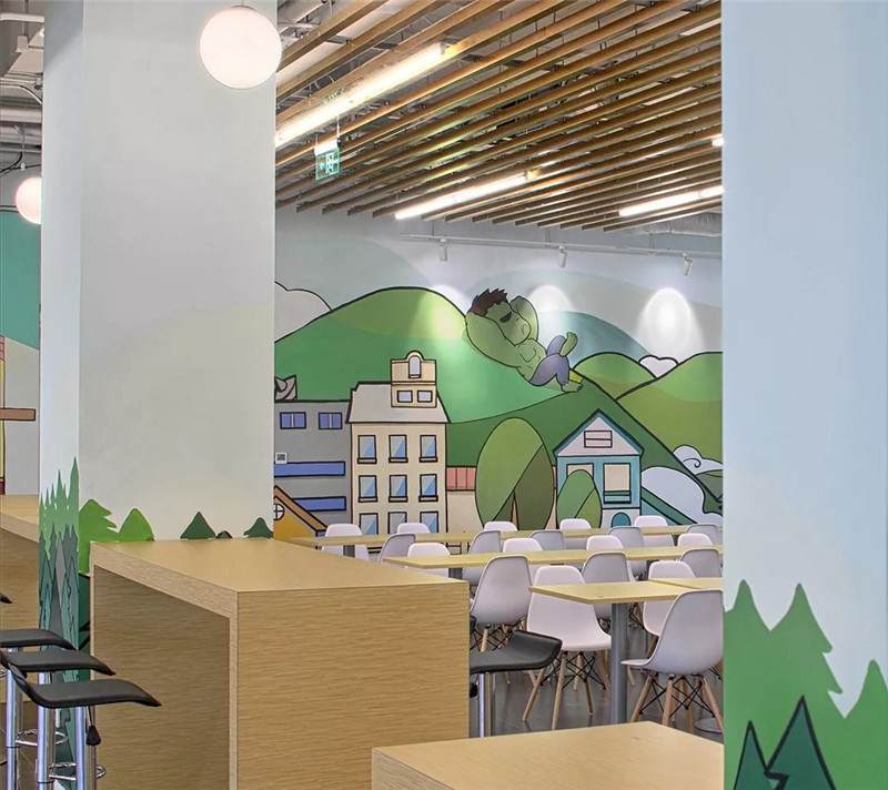 空間氛圍不同,所以圖形裝飾也會因地制宜的改變,用暖色更動(dòng)態(tài)的感覺。繪制的粉筆畫,可以定期的更換,像黑板報(bào)一樣制定不同的主題,它就是一面活的展示墻。