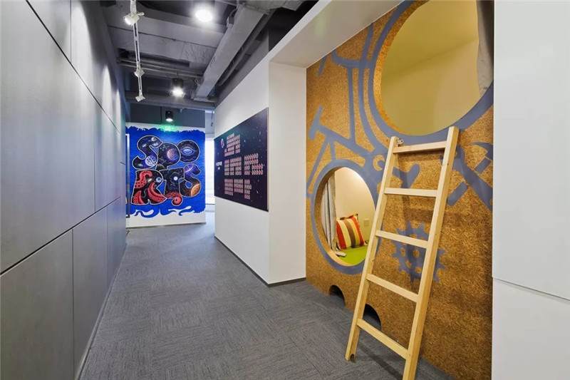 比如這張圖,也是華米科技北京的辦公室,用奧松板開兩個(gè)洞,精巧可愛的睡眠艙趴在墻上,利用兩個(gè)洞把它組成了自行車的輪廓,超萌的壁畫使墻面不再單一,色彩的對比更加直觀,同時(shí)用太空艙的形式增添趣味點(diǎn),不論是做設(shè)計(jì)師還是做工匠,都要秉持設(shè)計(jì)的理念去進(jìn)行選材和制造工藝,把握好每一個(gè)細(xì)節(jié)。