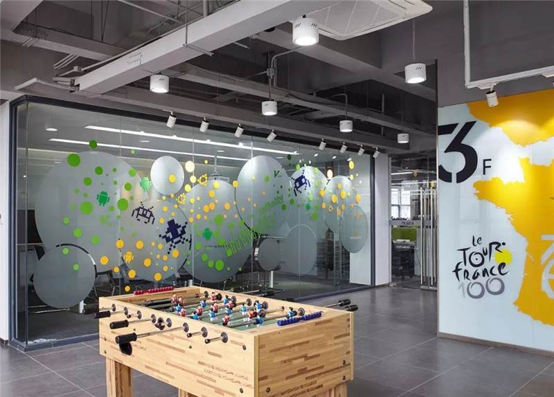 第二張中可以看到,桌上足球,這一張是會議室的玻璃貼膜,最初設(shè)計(jì)的都是一些彩色的圓點(diǎn),但是做完后太通透,起不到遮擋作用,所以現(xiàn)場臨時(shí)在玻璃的內(nèi)側(cè)又加了大型的磨砂圓,就有兩層疊加到一起的圖形,磨砂與色彩組合在一起,效果豐富有層次。