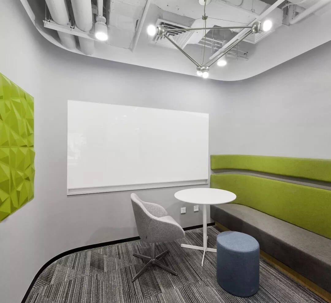 在軟裝設(shè)計(jì)上,該區(qū)域家具軟裝及墻壁,選擇明快的色調(diào),展示青春活力,并且用黑色烤漆玻璃內(nèi)嵌燈帶的方式營造氛圍,透著數(shù)字化和科技感,表現(xiàn)商湯在數(shù)字時(shí)代的不同場景中,所呈現(xiàn)的多元化和創(chuàng)新性。