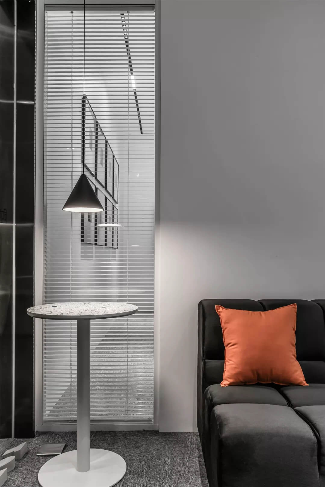 為了同時(shí)保證隱私和透明,張馳有道。會(huì)議室采用了玻璃+百葉窗的設(shè)計(jì),這樣的交流區(qū)域保持彼此的通透與聯(lián)接,提升了場(chǎng)所的張力。使用貼合設(shè)計(jì)的局部掛畫(huà)藝術(shù),配以金屬的深邃感官,多媒體影視裝置加強(qiáng)了墻面空間的信息輻射作用。