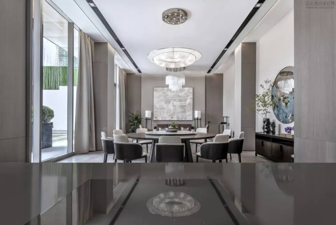 私宴,是以當(dāng)代設(shè)計(jì)來描繪文人飲酒時(shí)追求的清雅意境,寄情於山水??臻g通過折疊門和西廚吧臺(tái)區(qū)產(chǎn)生互動(dòng),空間功能既獨(dú)立又有相互滲透。延續(xù)簡(jiǎn)潔流暢的線條,布置與空間密切配合。