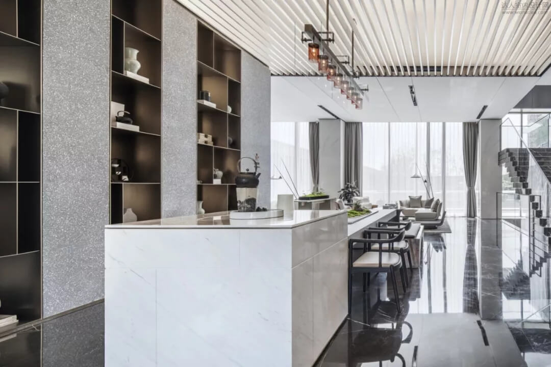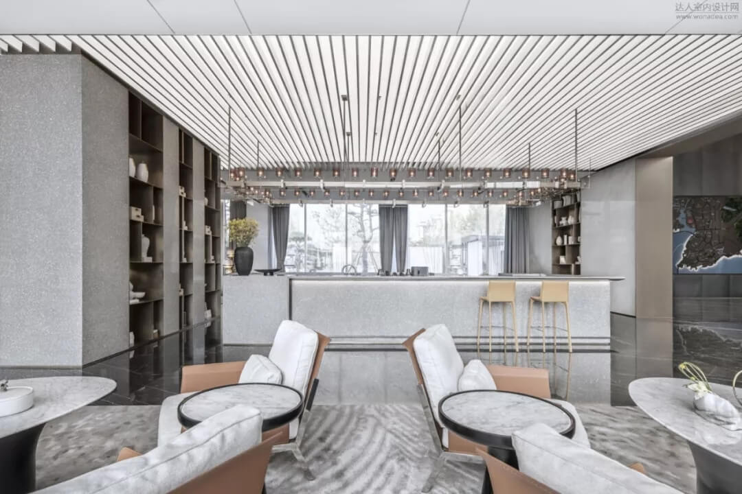 進(jìn)入洽談區(qū)大廳,通過大面積全明落地玻璃窗,最大程度地將室外的建筑、景觀效果納入室內(nèi)視野,以觀景式空間概念記錄時(shí)移景易的歲月縮影。圍合形的水磨石吧臺(tái)猶如藝術(shù)裝置,成為空間的中心焦點(diǎn)。