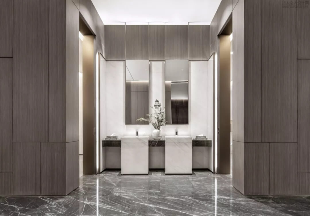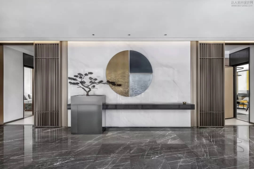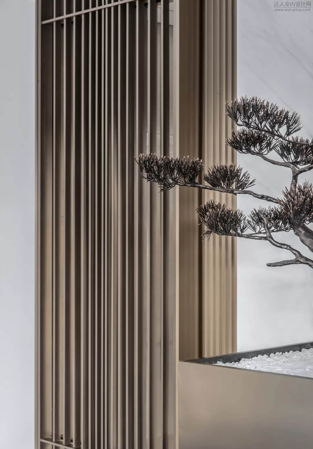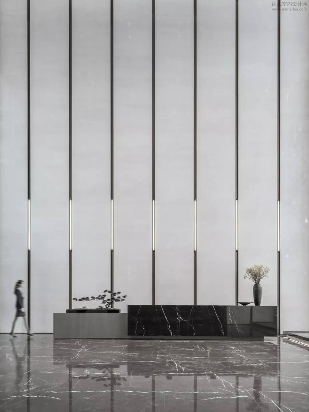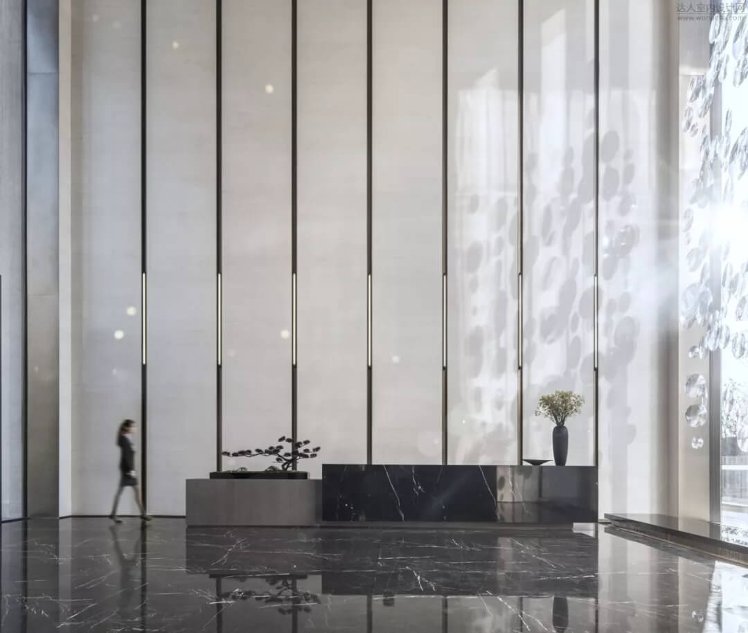 通過豐富的景觀區(qū)進(jìn)入門廳,感受到空間的空靈,立面設(shè)計(jì)過濾了來自于外界的繁復(fù)。十米挑空的大廳,墻面以米色砂巖為基底,黃銅色金屬強(qiáng)化縱向的比例,凸顯出空間的氣勢(shì)。入口對(duì)景設(shè)置的水景讓穿梭其中的訪客仿若能傾聽到潺潺水聲,同時(shí)水景和懸掛的軟裝裝置相得益彰,充滿巧妙的用意,同時(shí)也分隔了挑高通透的玻璃幕墻,虛實(shí)結(jié)合,體現(xiàn)現(xiàn)代設(shè)計(jì)的東方神韻。