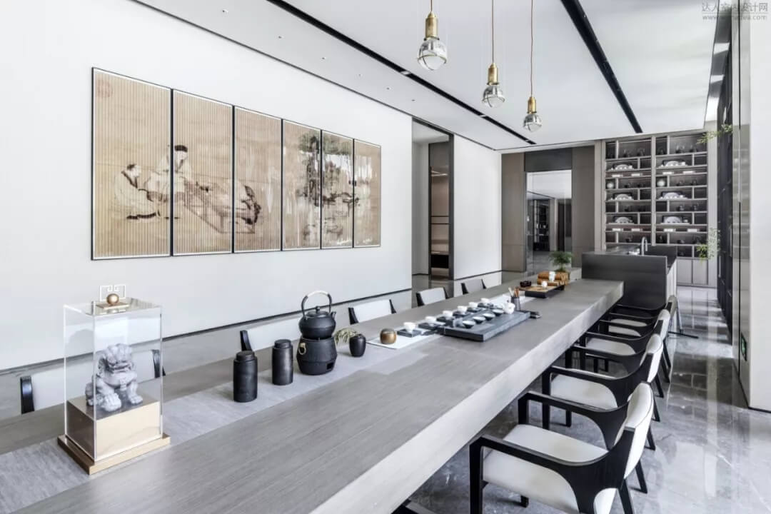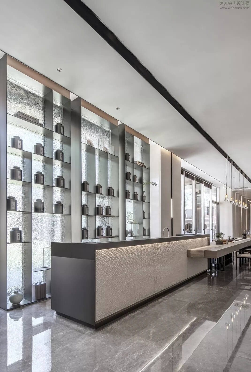 在會(huì)所品茶水吧臺(tái)區(qū)結(jié)合枯山水造景,色彩雅致內(nèi)斂,充分展現(xiàn)了中國人素來喜愛的‘靜’,同時(shí)超長條的品茶臺(tái),利用下沉庭院的景觀和室內(nèi)產(chǎn)生了互動(dòng),模糊了室內(nèi)外的界限。藝術(shù)儀式感的空間給人帶來思考的余地。