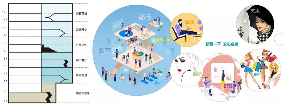 在此理念和品牌屬性的影響下,艾迪爾設計師布局辦公和診療空間,傳達出“舒適溫暖,積極自信,時尚藝術(shù),活力陽光”的氛圍。因此在大廳布局“美麗生活館”,建筑南側(cè)每兩層設計成不同主題的公共空間。