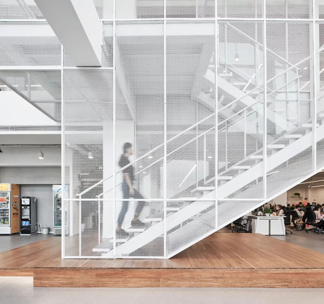云端漫步主題島樓層公共空間設置了木質(zhì)的懸掛BOX,用白色的鋼網(wǎng)樓梯連接,樸素和輕盈通透形成鮮明的對比,如云端漫步,自然中蘊含天馬行空,打開員工的創(chuàng)意想象。