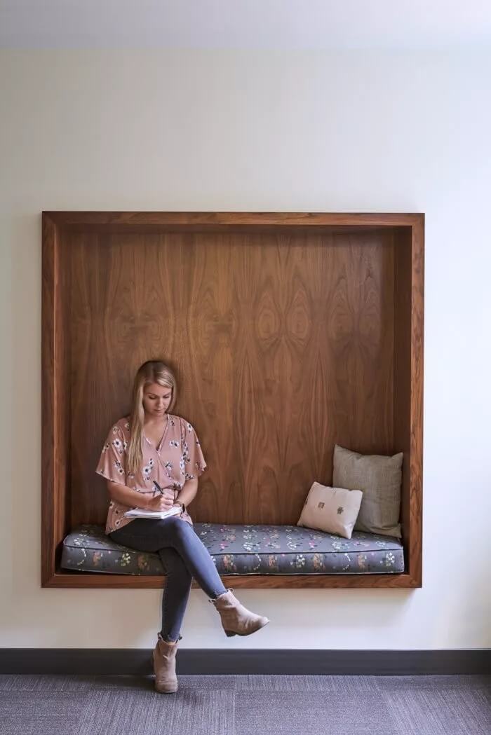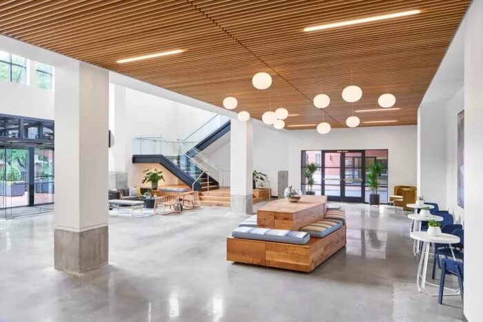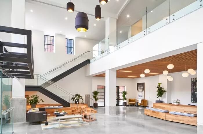 曾經(jīng)被濫用的中庭被重新構想成該機構的心臟-充滿活力的會議區(qū)和一間酒吧,設有來自里士滿地區(qū)的旋轉(zhuǎn)水龍頭。大堂取代了傳統(tǒng)的bun堡般的接待臺和獨立的休息區(qū),而是變成了一個畫廊—充滿活力,動感十足,并嵌入了里士滿的性格。還有接待處?那個也被定制的鋼制桌子代替,該桌子可以兼作員工的共同工作空間。