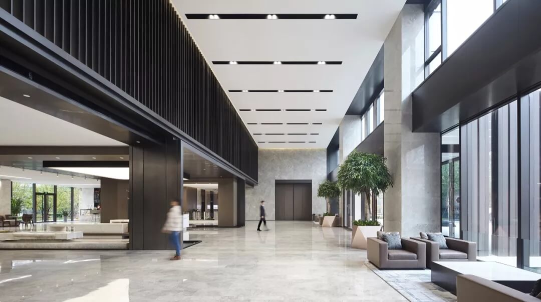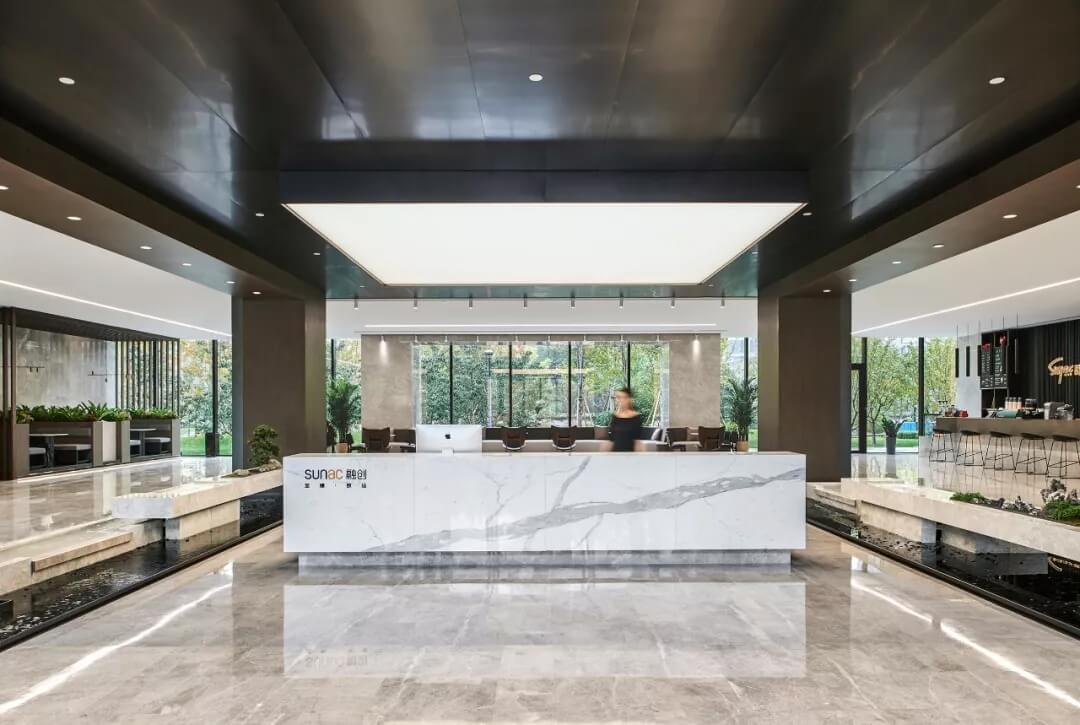 大堂是開(kāi)放,通透,自然的園林式空間,自成一片天地。踏入大堂即可看到前廳接待島,方形四面通透的造型,嚴(yán)謹(jǐn)不失靈活,結(jié)合流動(dòng)水景和盆景,營(yíng)造了生態(tài)的,四季怡情的綠色辦公。電梯廳出入口在接待島兩側(cè),實(shí)現(xiàn)快速集散,避免上下班高峰期等候擁堵??Х鹊群騾^(qū)玻璃窗形成框景,把室外花園內(nèi)的四季變幻,自然元素都納入到室內(nèi)來(lái),形成情景共融。
