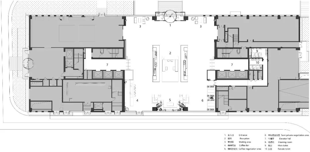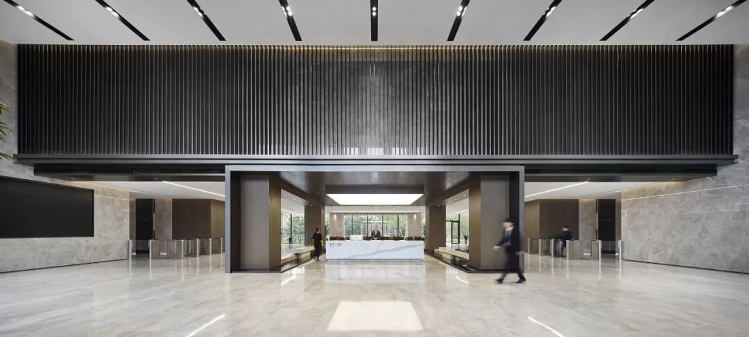 設(shè)計(jì)師通過(guò)空間布局,材料選用等營(yíng)造出大堂沉靜務(wù)實(shí)、理性的空間氛圍,咖啡,水聲,盆景,窗外的花園,以及往來(lái)的員工,客戶和行人賦予這里靈魂和氣息,使整個(gè)大堂充滿各種可能性。