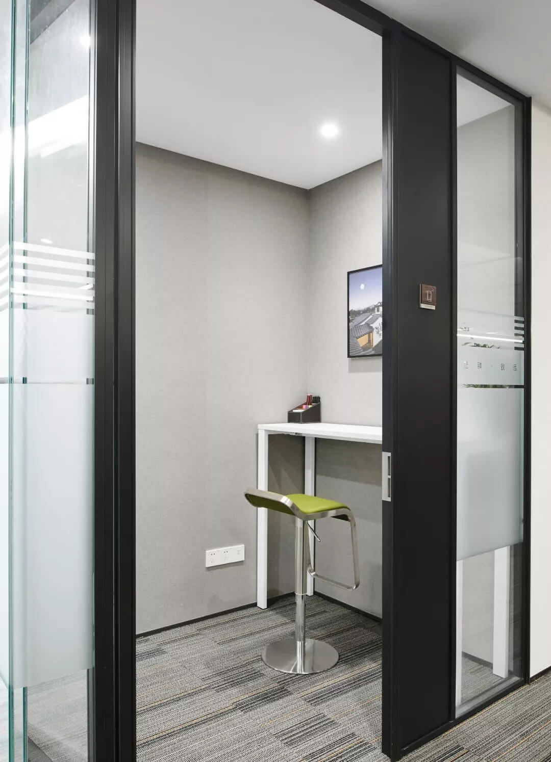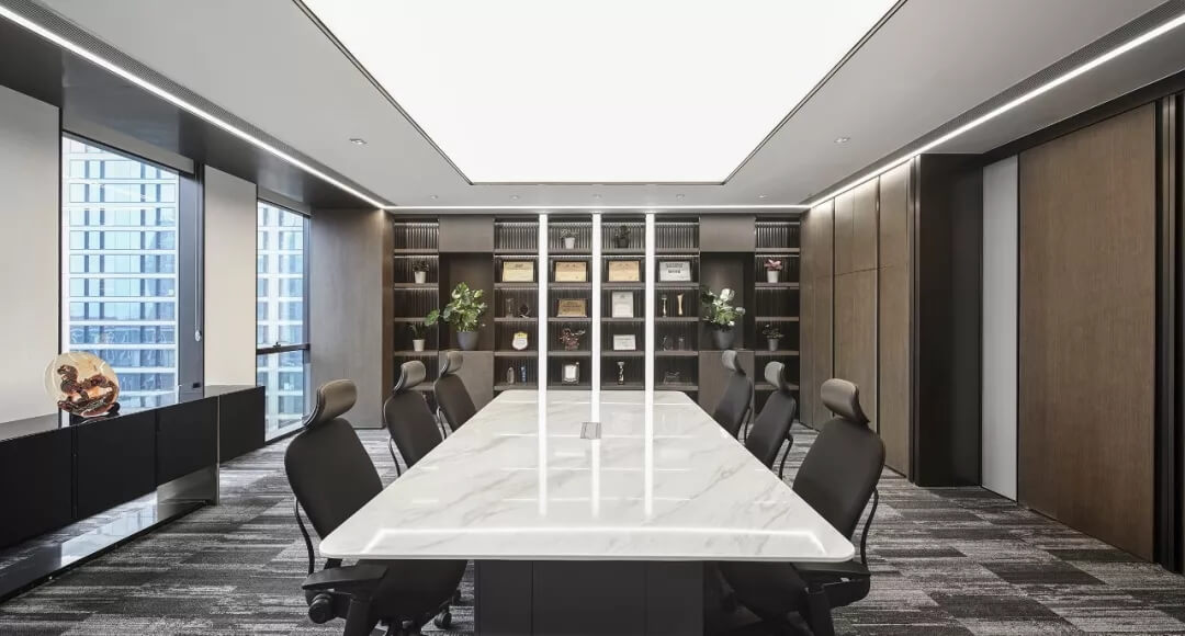 設(shè)計(jì)師綜合融創(chuàng)的不同會(huì)議使用訴求以及原建筑結(jié)構(gòu),在空間布局上,打造核心筒混合會(huì)議帶,不同大小、不同形式的會(huì)議空間嵌套在每層開(kāi)放辦公區(qū)的不同位置,滿足多元化會(huì)議需求;卡座,開(kāi)敞洽談區(qū),休閑洽談區(qū)滿足互動(dòng)交流,頭腦風(fēng)暴式會(huì)議需求。多層次多功能的交流會(huì)議由智能系統(tǒng)高效管理,體現(xiàn)融創(chuàng)開(kāi)放、包容的企業(yè)文化。