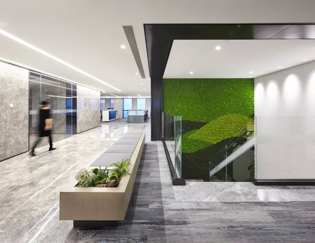 八層原場(chǎng)地建筑南側(cè)是一座覆土花園平臺(tái),出電梯廳南側(cè)是簡(jiǎn)潔寬敞的接待廳,空中花園相對(duì)的兩側(cè)分別布局兩間辦公室,為了使戶外的自然元素與室內(nèi)連接,設(shè)計(jì)師把朝花園一側(cè)建筑幕墻改為大推拉玻璃移門,使視野更開(kāi)闊,花園盡收眼底,也可隨時(shí)出入體驗(yàn),加強(qiáng)了與自然的聯(lián)系。
