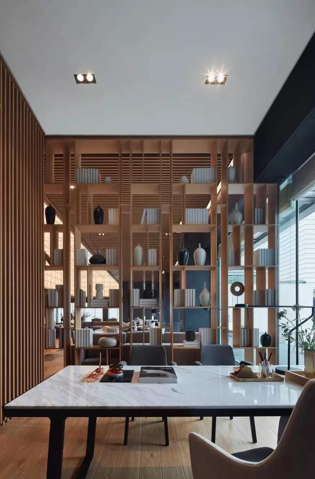 VIP區(qū)域原木色書架、豎向的木百葉有效阻隔區(qū)分空間,與周圍關(guān)系相互連接又互不打擾,形成半開放式的私密空間,整體保證了空間的互動性與獨(dú)立性。在這個(gè)“書卷留白筆墨濃”的區(qū)域,營造出靜心一隅,構(gòu)筑具有人文氣息和品質(zhì)感的氛圍。