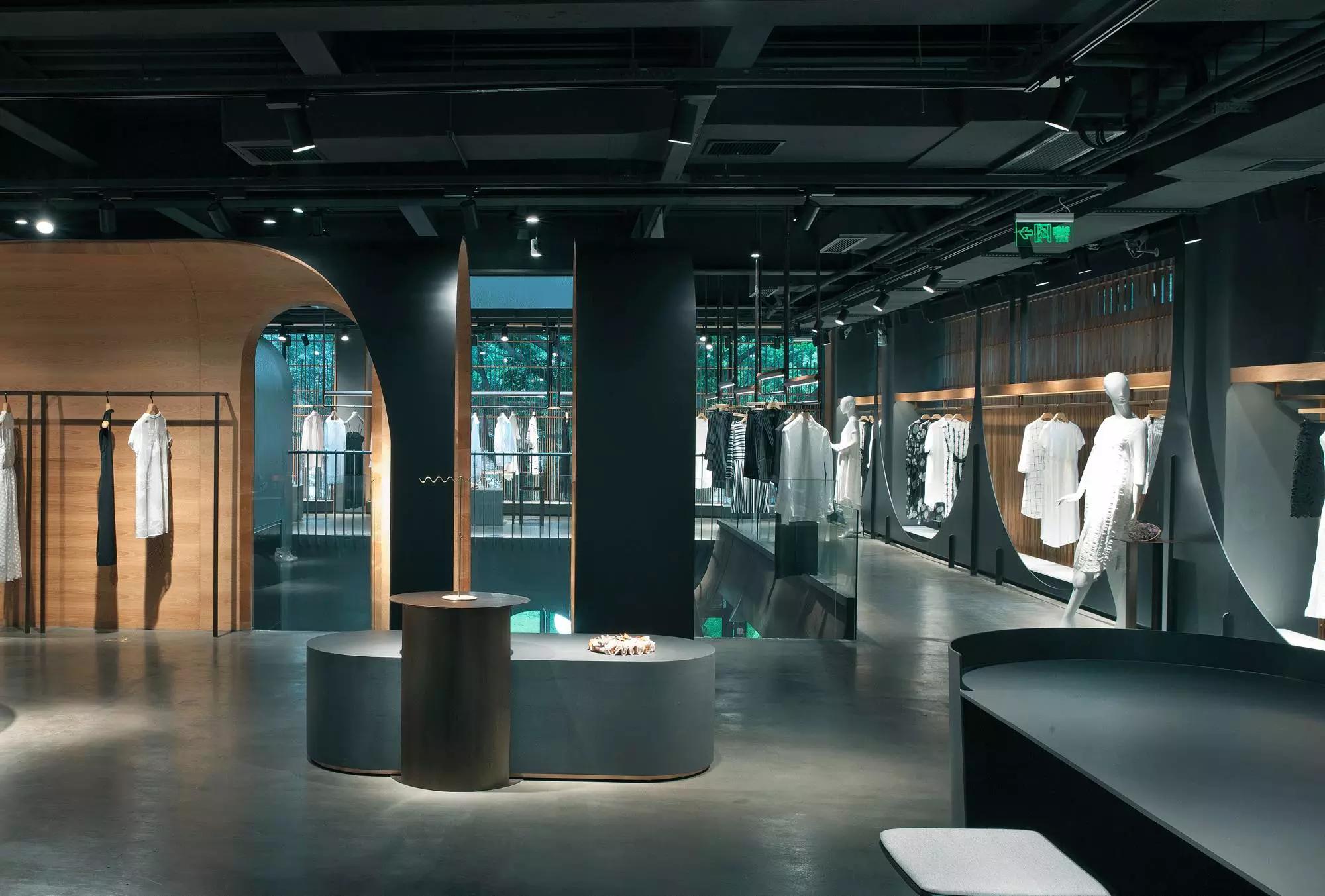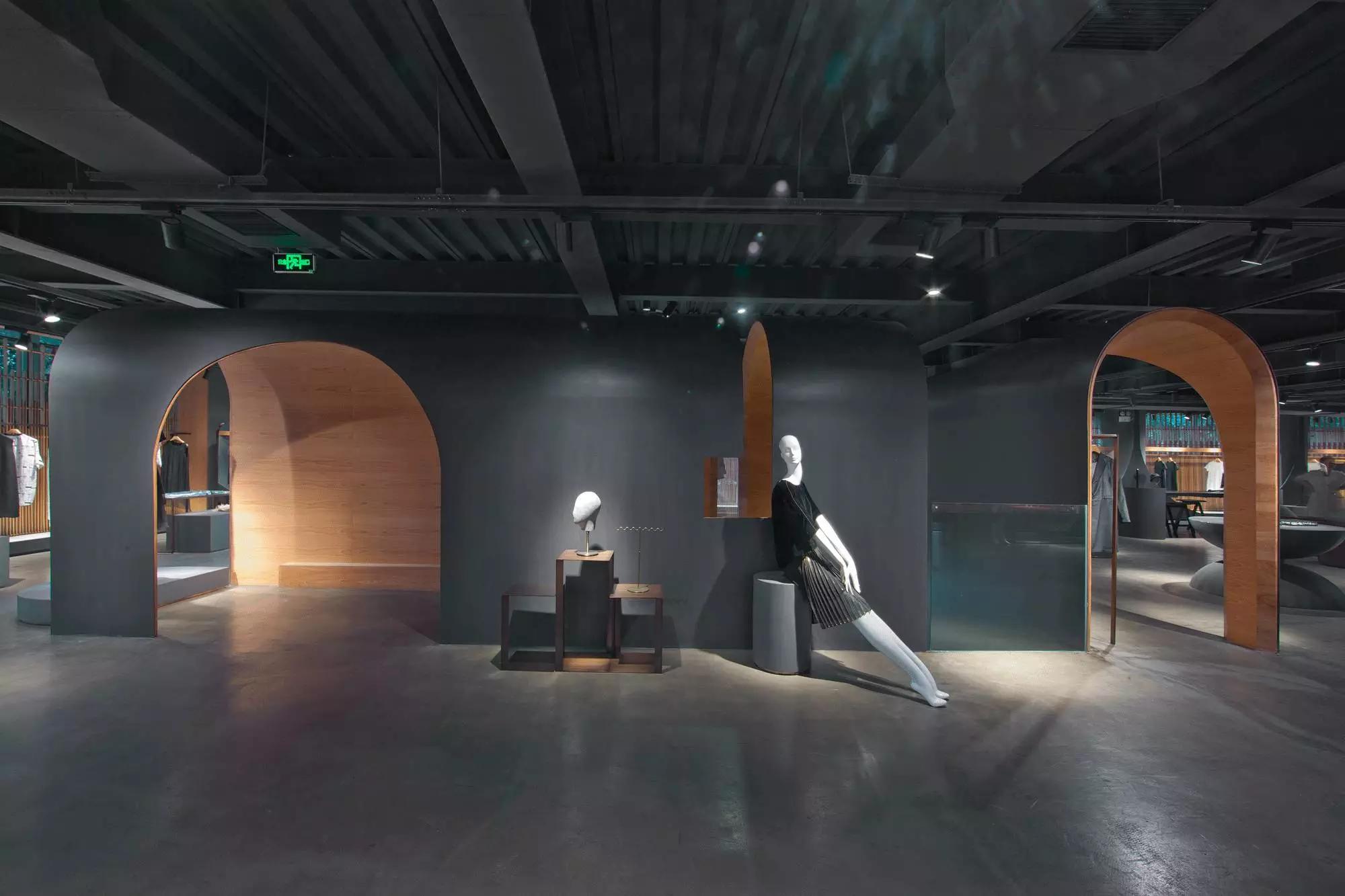 內(nèi)部空間希望呈現(xiàn)一種原始野性的魅力,采用鋼制的表皮帶來一種現(xiàn)實感。這種“直白”式的架構(gòu)材料,空間所形成的直接性與樸素性,加上大尺度的鋼板落地產(chǎn)生的力量感或輕盈感,使整個空間與原有場地建筑取得一種時間與空間的接續(xù)關(guān)系。利用“拱”多變的空間特性,產(chǎn)生不同的空間,打破了均質(zhì)的體驗。這是一個回憶的過程,再一次將建筑的體量與空間對話,越是簡單的形體邏輯,越能給人帶來深刻的印象,弧拱曲線柔和,呈現(xiàn)不同角度的美感。弧拱的連續(xù)曲線把空間構(gòu)造成圍合區(qū)域,在這樣的方式下,內(nèi)部和外部保持著空間的連續(xù)性,這個理念使空間不拘泥于常規(guī),探索傳統(tǒng)類型空間的新秩序,"拱"在傳統(tǒng)建筑中扮演重要角色,并且在漫長的歷史中不斷豐富。我們試圖轉(zhuǎn)化傳統(tǒng)"拱",讓"拱"在均質(zhì)呆板的現(xiàn)代空間上制造新的突破,獲得自然能量并把它轉(zhuǎn)化為空間秩序。濃烈的空間美感,顯示該品牌的重要意義?;」巴臻g一、二層相連,創(chuàng)建出有趣的空間狀態(tài),吸引顧客的好奇心。