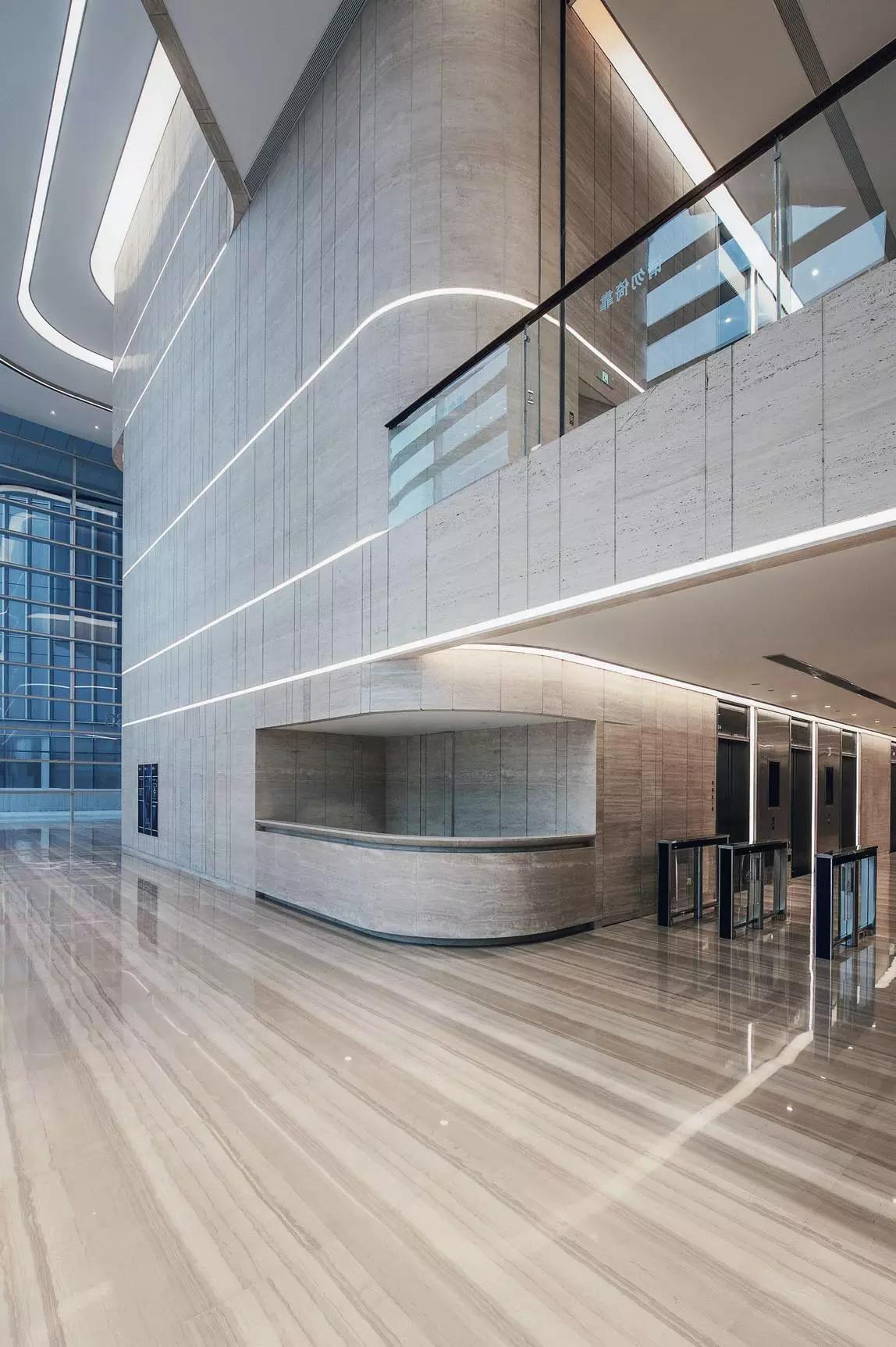 大堂設(shè)計將空間塑造作為首選,將形式、質(zhì)感、光與影等要素組合融入,創(chuàng)造性的表達(dá)空間的品質(zhì)和精神,放棄了多余的裝飾與造型,著重展現(xiàn)室內(nèi)空間與建筑空間的統(tǒng)一性。