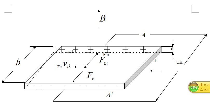 所謂霍爾效應(yīng):相當(dāng)于把一塊寬為b,厚為d的導(dǎo)電板放在磁感應(yīng)強度為B的磁場中,并在導(dǎo)電板中通以縱向電流I ,此時在板的橫向兩側(cè)面A、A′,之間就呈現(xiàn)出一定的電勢差,這一現(xiàn)象稱為霍爾效應(yīng),所產(chǎn)生的電勢差UH稱霍爾電壓。高斯計就是利用這一原理來測量磁場強度的。如圖所示: